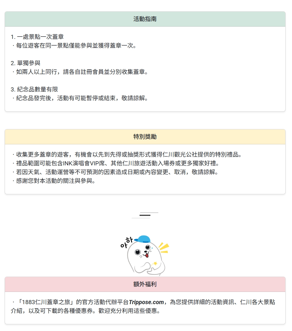 * 在网站的Google地图上可以找到每个印章之旅地点,点击“查看更多”则可跳转至Trippose.com获取详细信息。也可以在网站主页点击“1883仁川全球集章之旅”参与点位按钮,查看所有可参与的景点。
