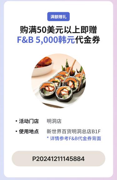 5,000韩元餐饮券(单笔消费满50美元可用)