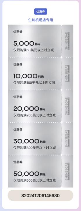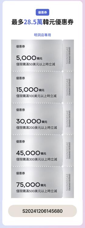 - 购物券及优惠券仅发放给新世界免税店注册会员。