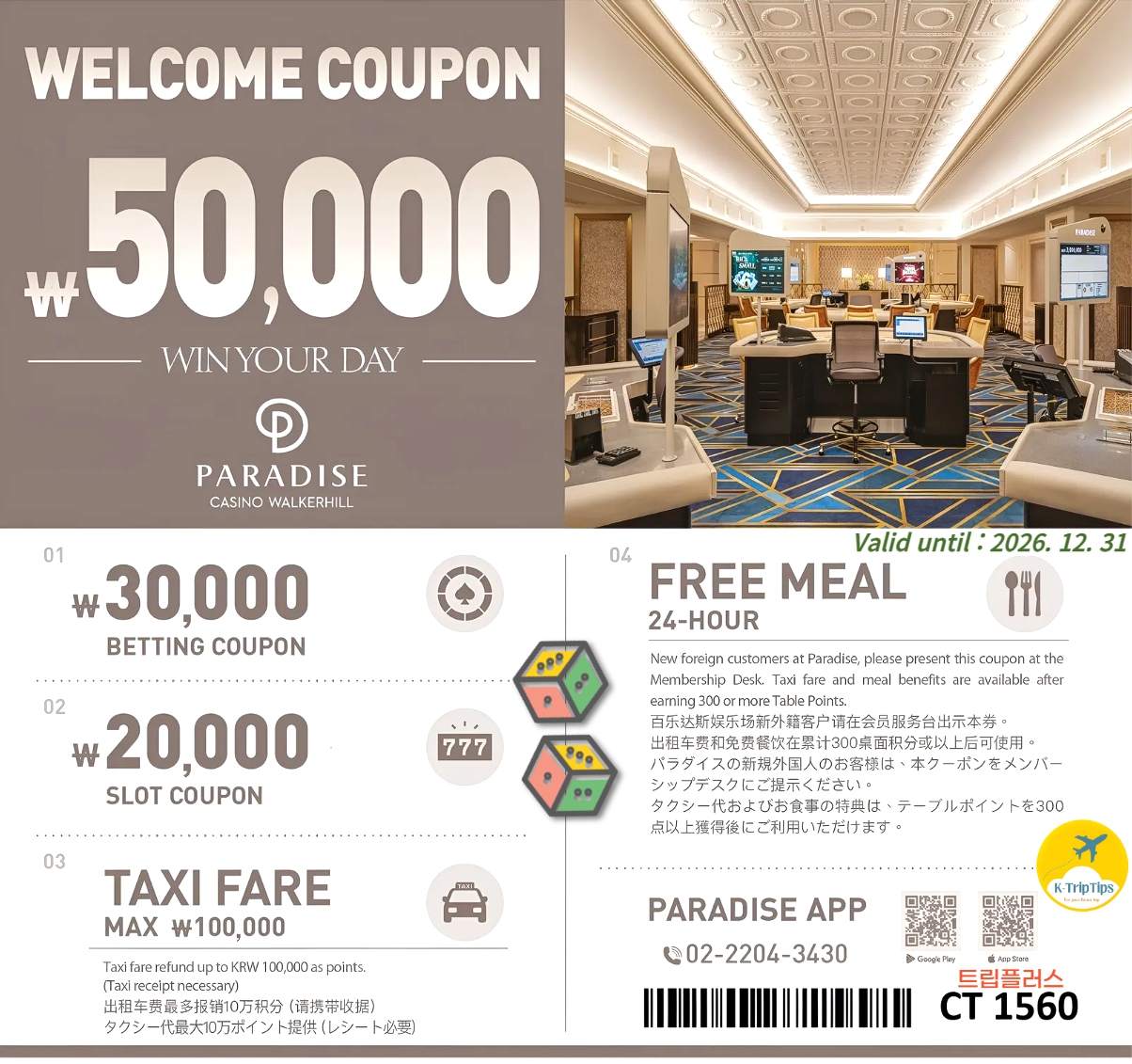 Experience the pinnacle of luxury gaming at Paradise Walkerhill Casino on your journey through Korea. Remember, your trip isn't complete without the exclusive benefits of the K-TripTips casino coupon for foreign visitors. Where Excitement Meets Elegance – Only at Paradise Walkerhill Casino.