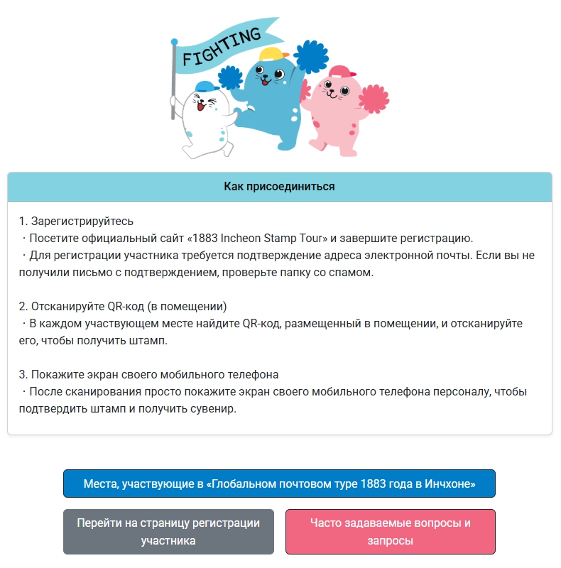 О: 1. Зарегистрируйтесь на сайте «1883 Incheon Global Stamp Tour».