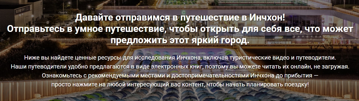 О: * Эти места разбросаны по всему Инчхону, включая аэропорт Инчхон, Вольмидо, Сондо, остров Канхвадо и остров Ёнджон. Полный список можно найти в туристических информационных центрах Инчхона или на нашем официальном сайте.