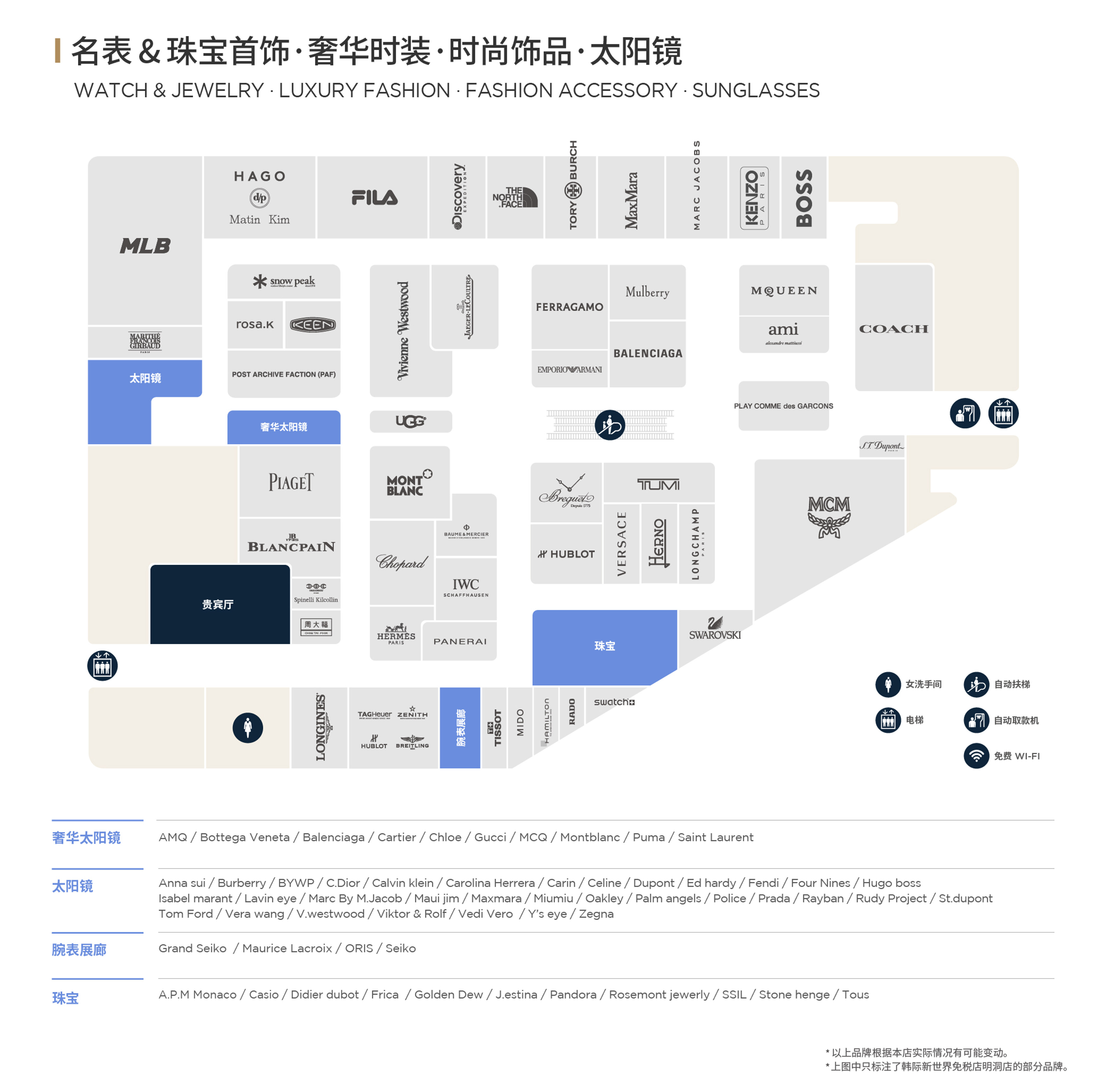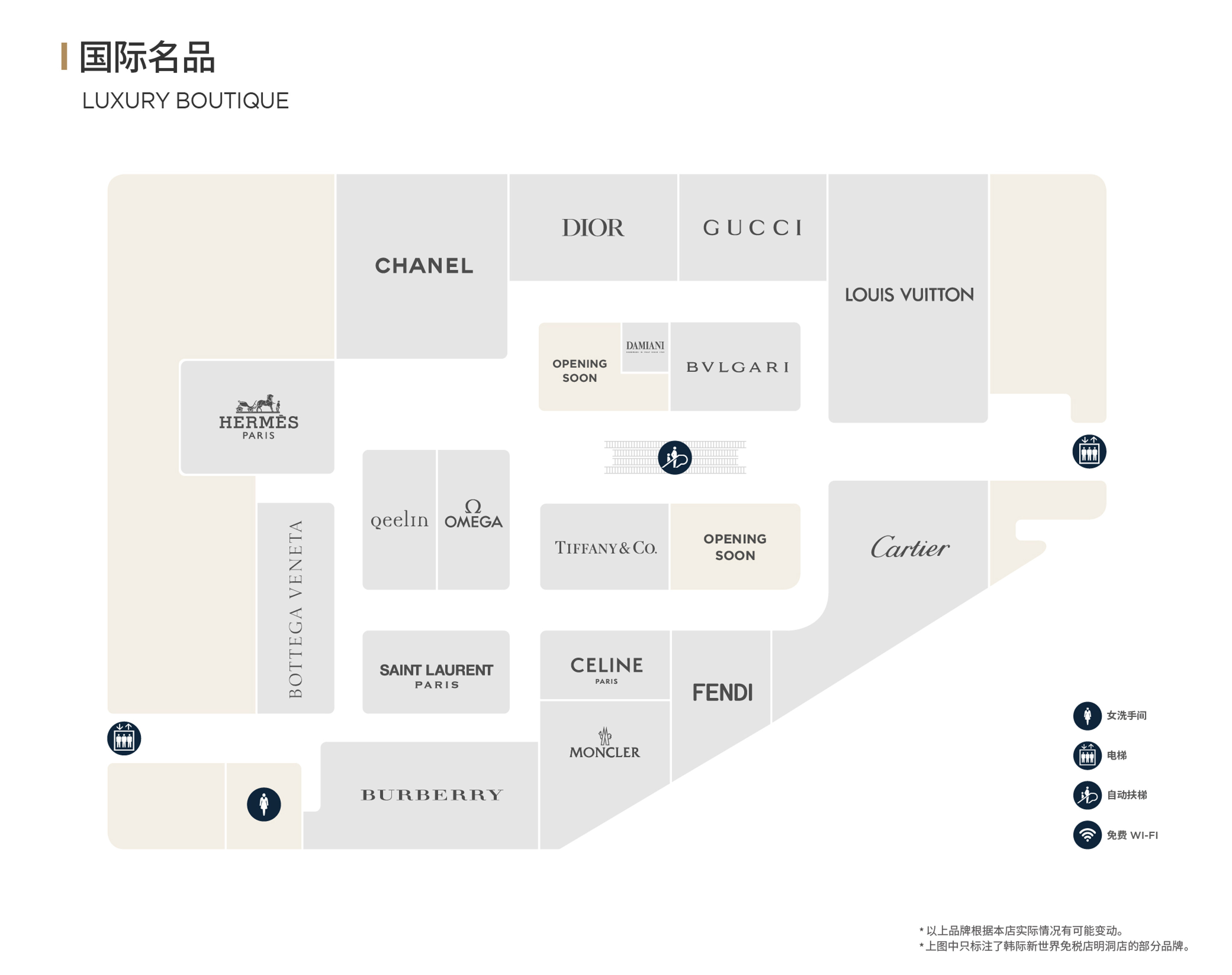 这里汇聚了世界顶级奢侈品牌:路易威登、古驰、圣罗兰、迪奥、巴宝莉、巴黎世家、葆蝶家、纪梵希、芬迪、思琳等。此外,还有卡地亚、宝格丽、蒂芙尼、梵克雅宝等高端珠宝品牌,以及欧米茄、浪琴、宇舶、泰格豪雅、天梭等知名腕表品牌。
