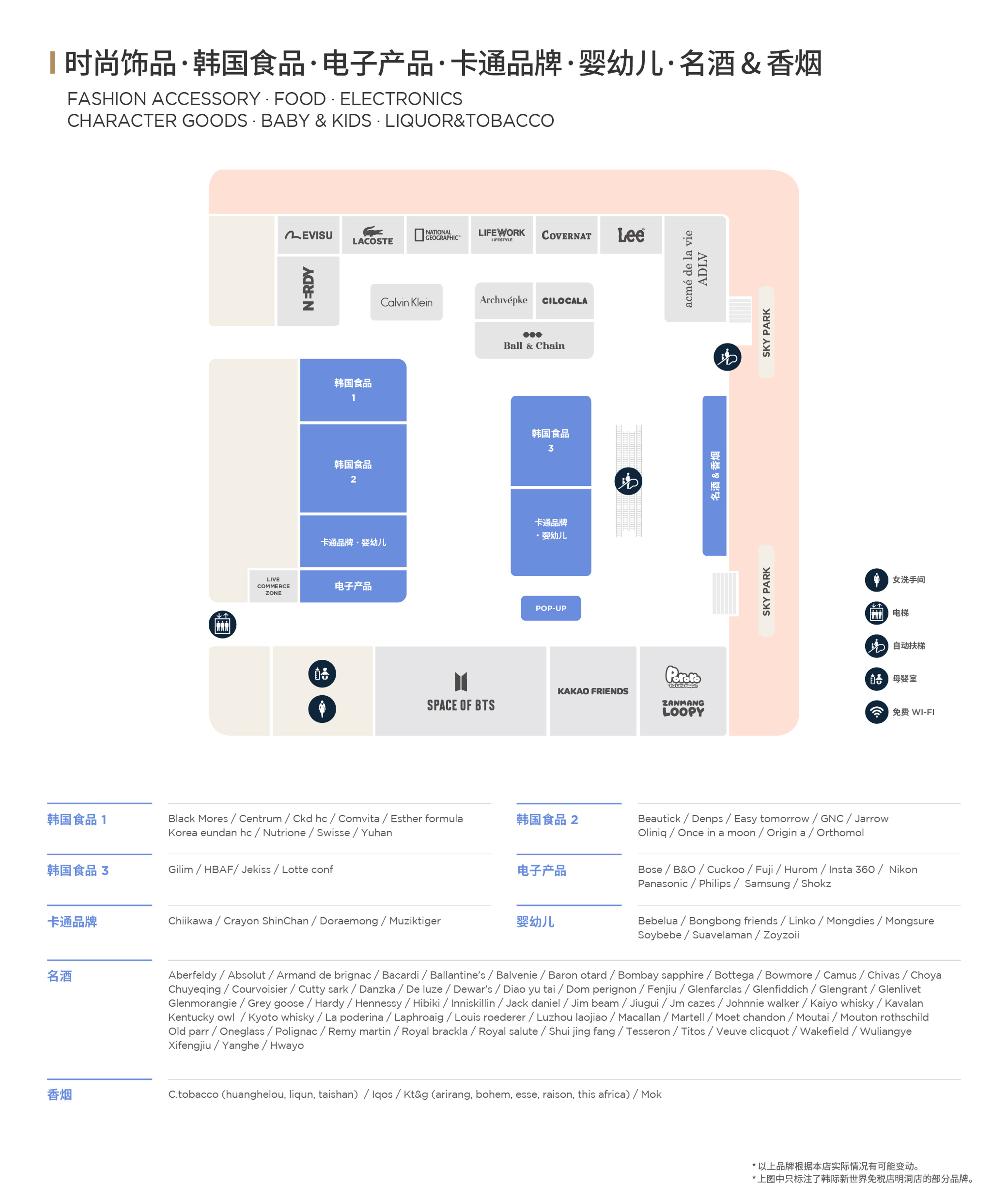 这里汇聚了LINE FRIENDS、KAKAO FRIENDS、Pororo等韩国人气卡通品牌,此外,还有正官庄(红参)、GNC、PEACOCK等健康食品品牌。逛累了?不妨到空中花园或咖啡厅稍作休息,享受悠闲时光!