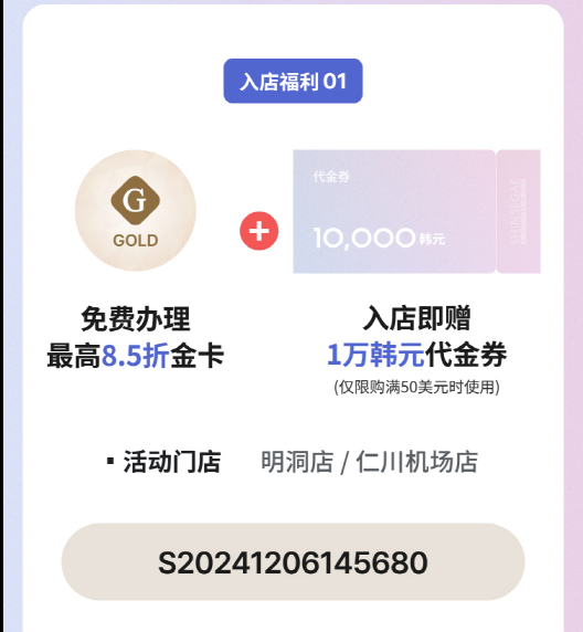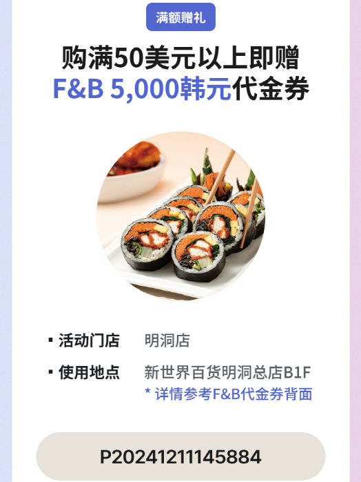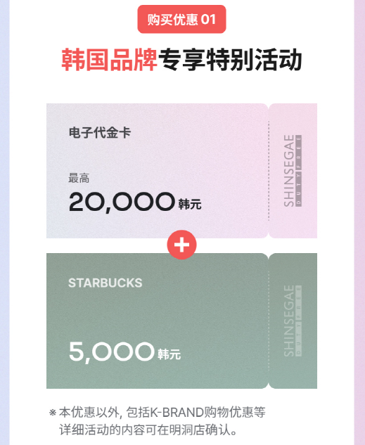 - 购物赠品(限明洞店):单笔消费满50美元,可获B1美食广场5,000韩元代金券