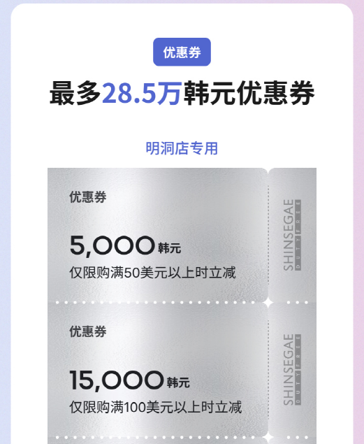 使用新世界免税店优惠券 & 特惠券,享受更多折扣优惠: