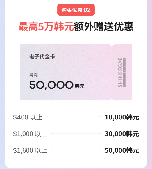 - 购物积分:单笔消费满50美元立减10,000韩元