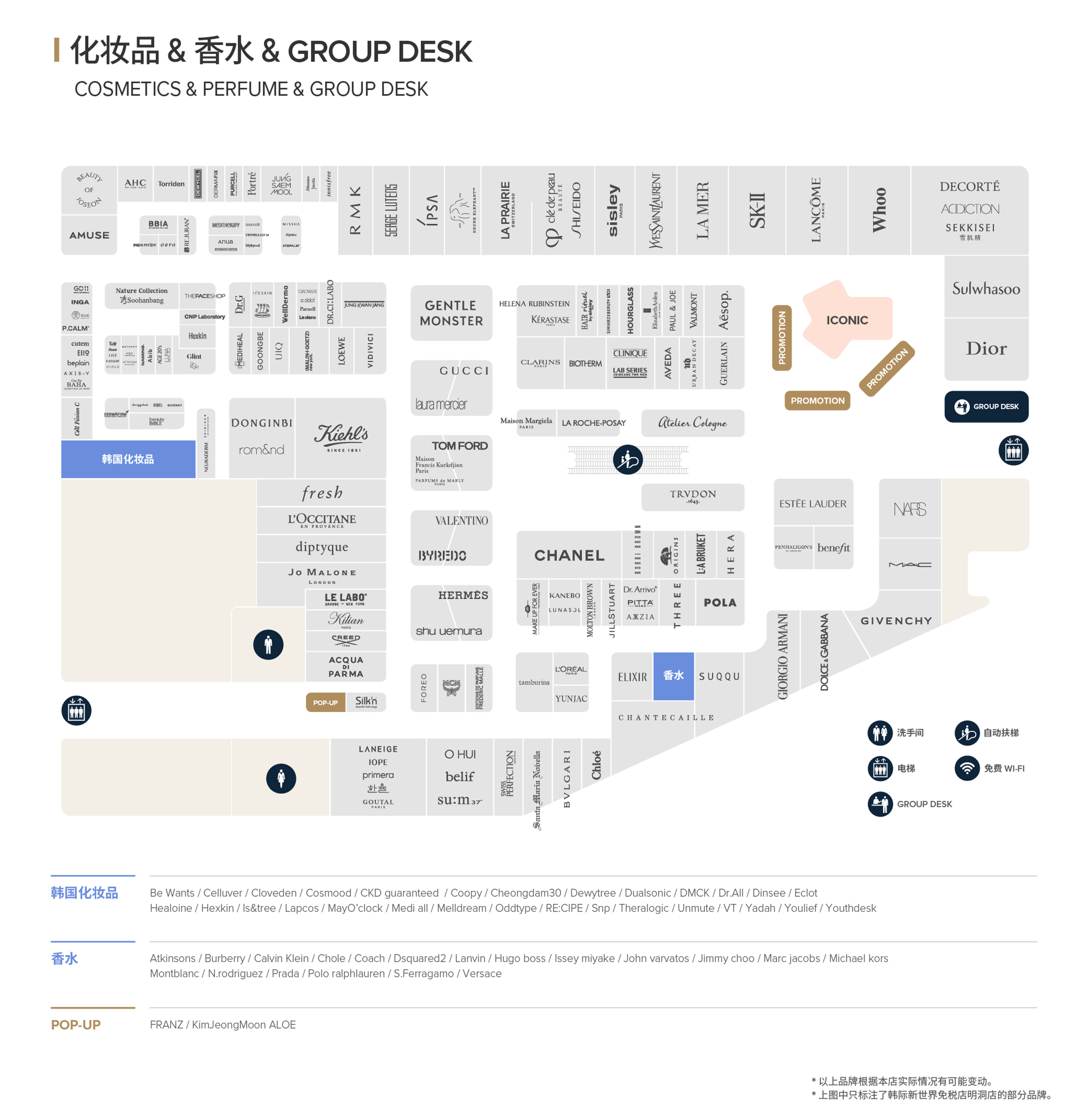 这里是韩流美妆爱好者的天堂!韩国本土品牌包括雪花秀、后、赫拉、兰芝、IOPE、su:m37°、Espoir、Primera、正官庄、OHUI、Belif、VDL、AHC、Dr.Jart+、Clio、谜尚、伊蒂之屋等。国际品牌则包括迪奥、兰蔻、香奈儿、娇韵诗、安娜苏、雅诗兰黛、NARS、纪梵希、植村秀、MAC、欧舒丹、贝玲妃等。