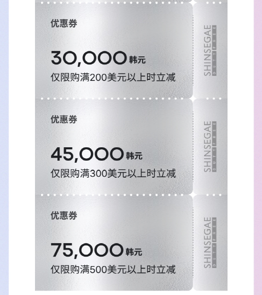 - 购物券及优惠券仅发放给新世界免税店会员。