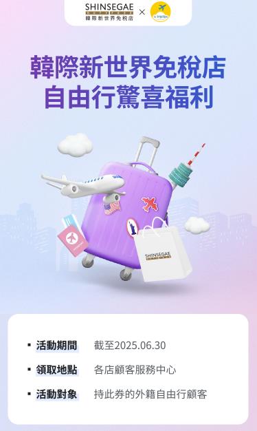 - 購物券及優惠券僅發放給新世界免稅店註冊會員。