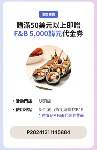 5,000韓元餐飲券(單筆消費滿50美元可使用)