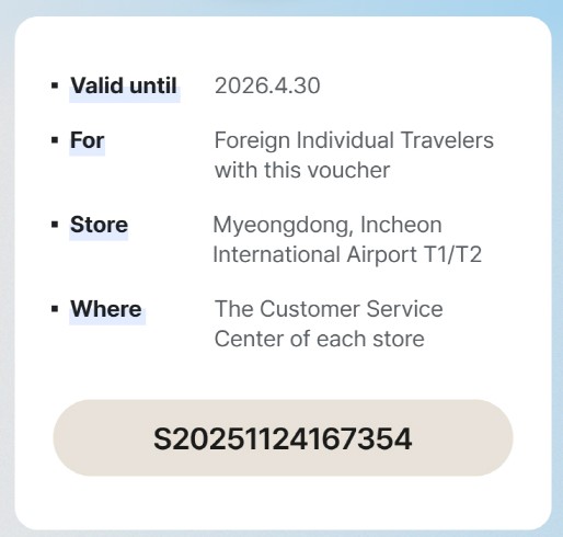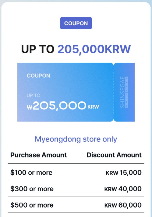 - Myeongdong store exclusive coupons: Save up to KRW 115,000 on purchases from USD 50 to USD 500+