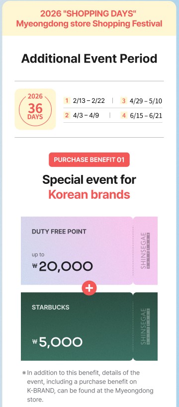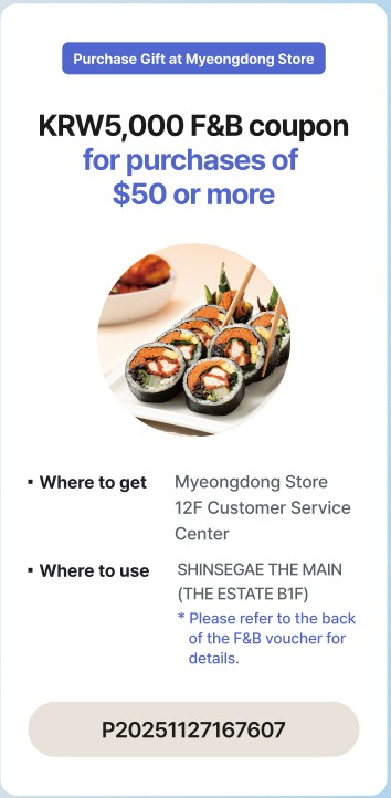 - Gift with purchase: Receive a KRW 5,000 food court voucher for purchases over USD 50