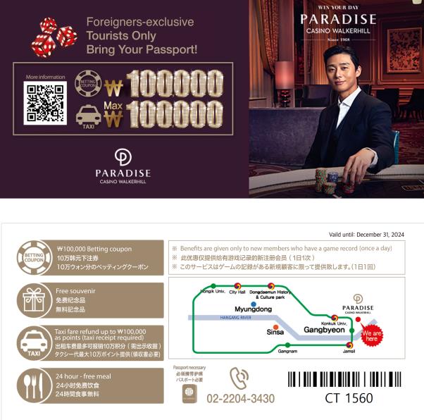 - パラダイスウォーカーヒルカジノ:80,000ウォンのベッティングバウチャー、無料の食事体験、タクシー運賃の払い戻し、無料のお土産を提供。