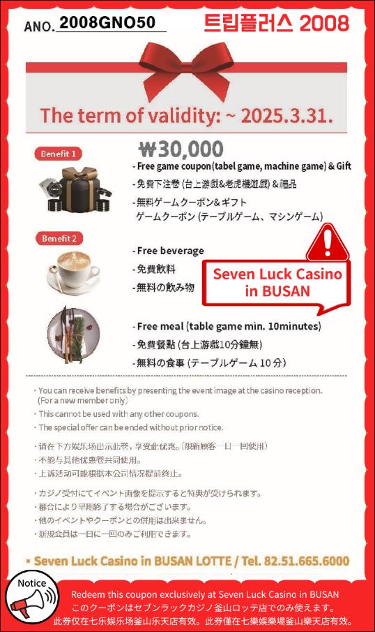韓国カジノを訪れる際には、特典と特別なサービスを受けるためにK-TripTipsが提供するクーポンを忘れずに提示してください。このクーポンは、あなたの韓国旅行とカジノでの体験をより一層特別なものにしてくれます。