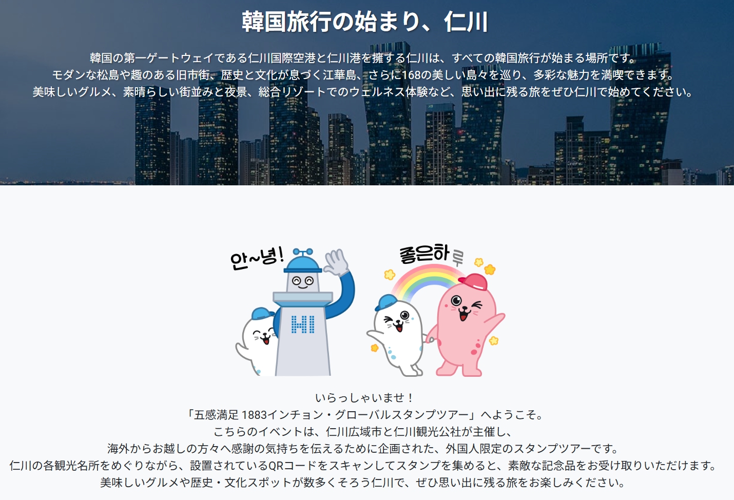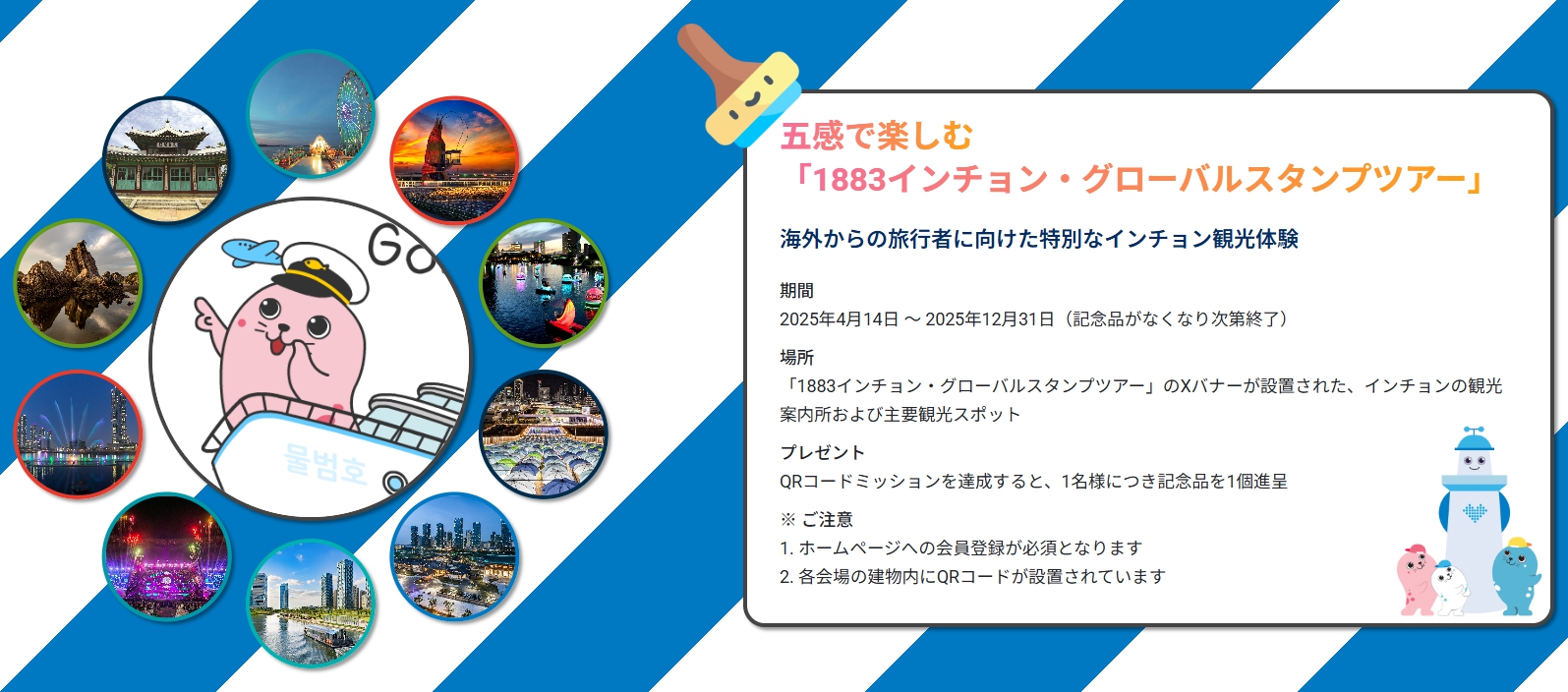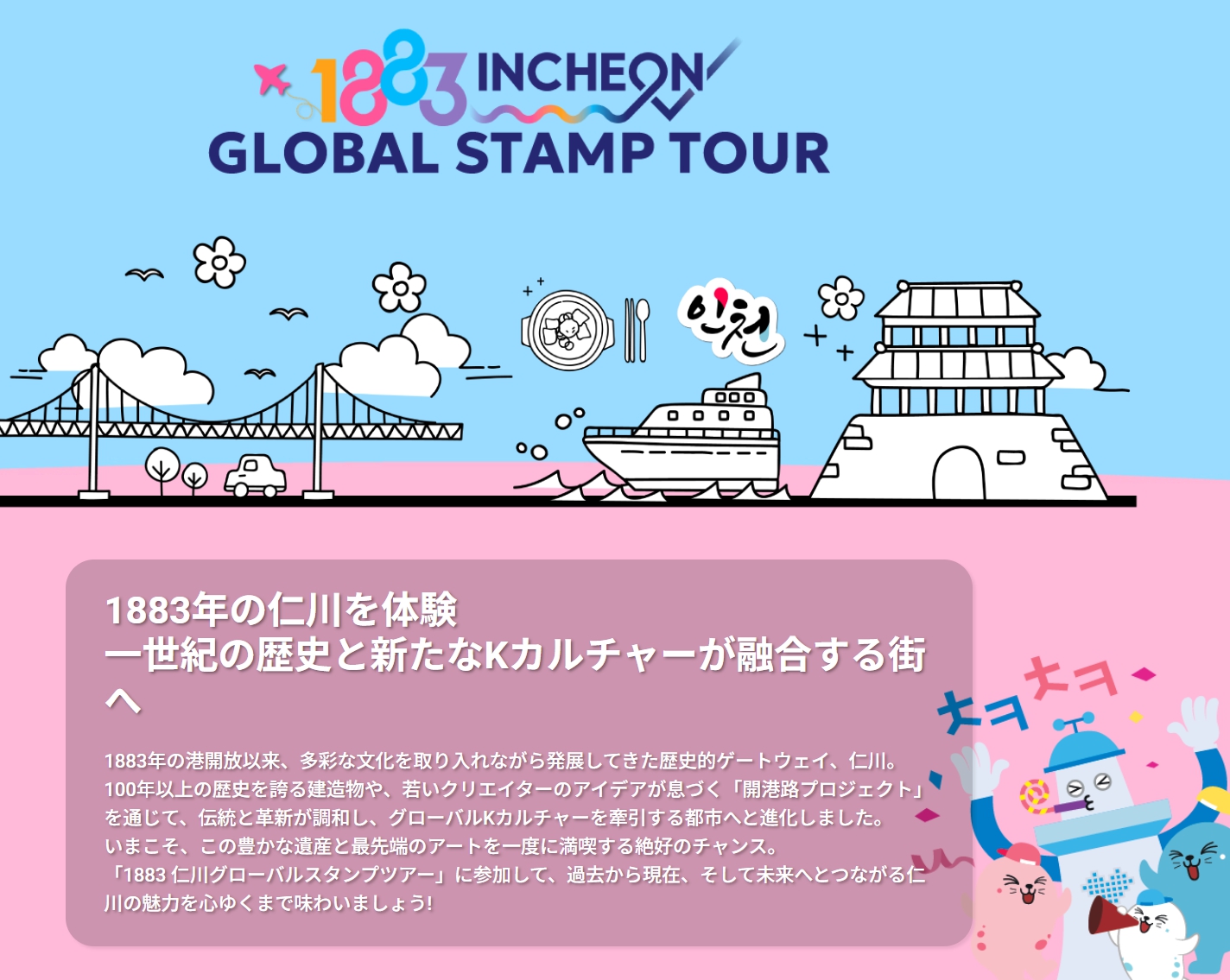A: 「1883仁川グローバルスタンプツアー」は、仁川が国際港として開港し、世界へとつながる玄関口となった1883年の歴史的意義にちなんだスタンプラリー形式のプログラムです。仁川の主要観光地や文化遺産を巡りながら各スポットでスタンプを集め、完走すると記念品を受け取ることができます。仁川の歴史・文化・グルメを同時に楽しめる素晴らしい機会を提供します。