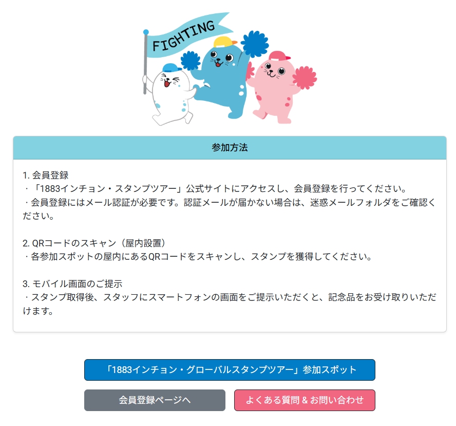 A: 1. 「1883仁川グローバルスタンプツアー」の公式サイトで会員登録を行ってください。