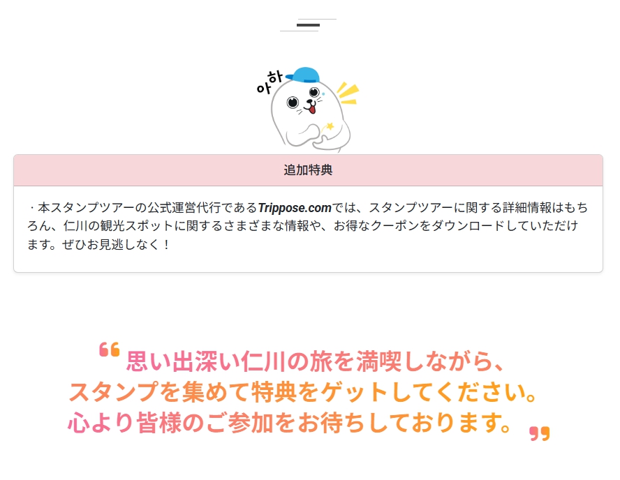 * ウェブサイトのGoogleマップに各スタンプツアーの場所が表示されており、「詳細を見る」からTrippose.comで追加情報をご覧いただけます。トップページの「1883 仁川グローバルスタンプツアー 参加スポット」ボタンからも全施設をチェックできます。