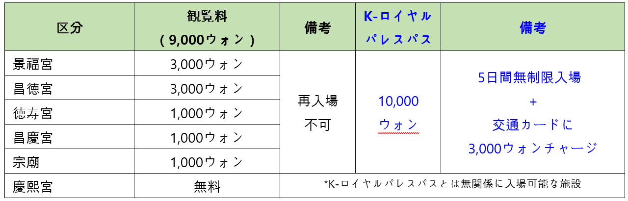 1. 5大宮(景福宮、昌徳宮、徳寿宮、昌慶宮、慶熙宮) 、宗廟無制限入場