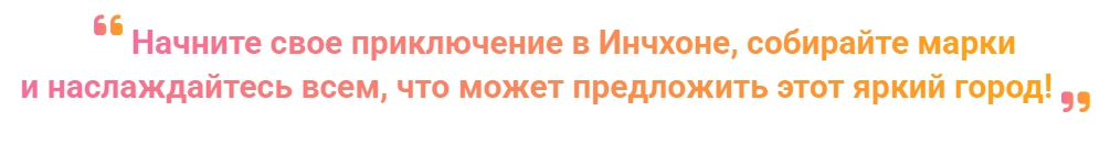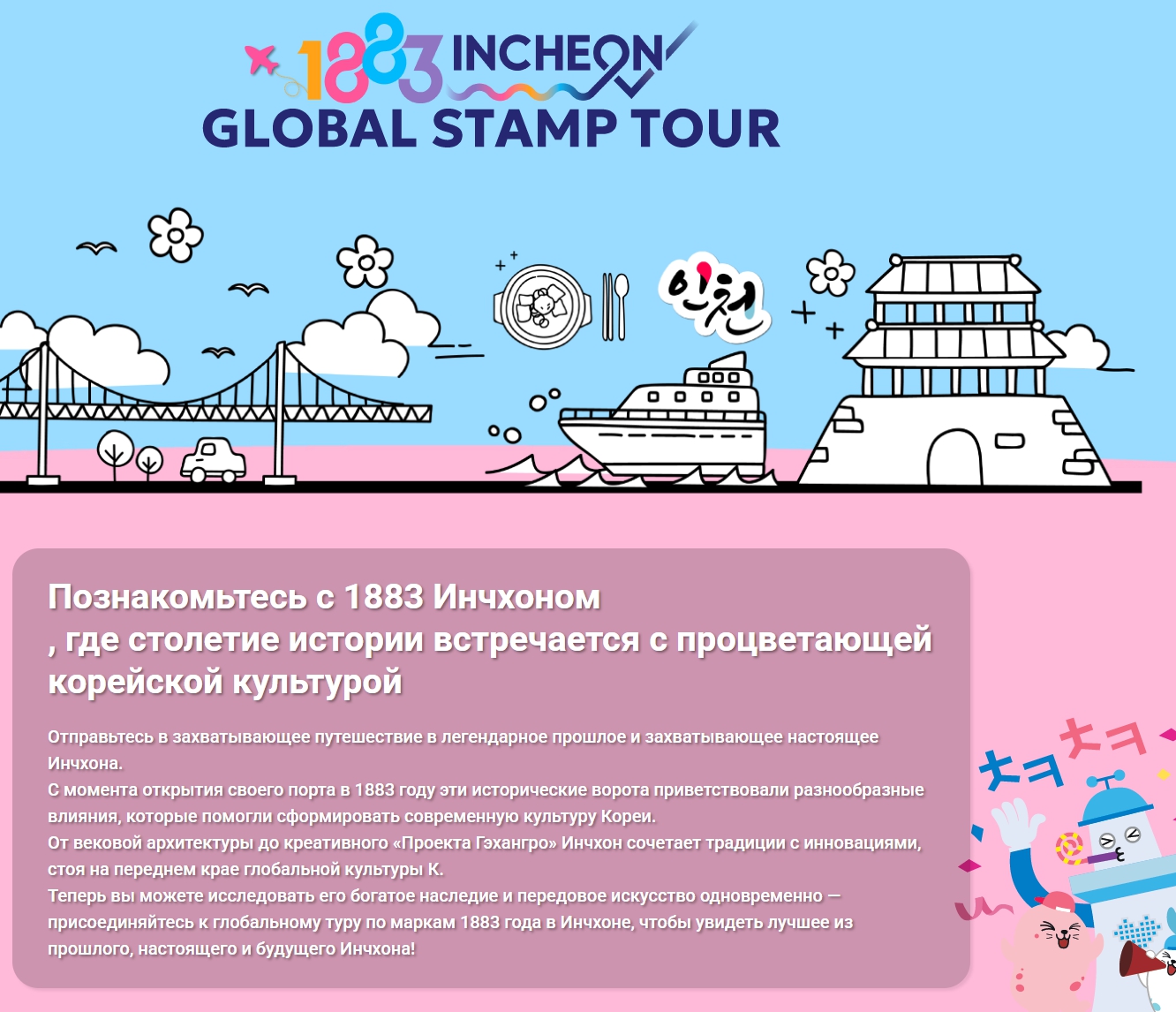 О: «1883 Incheon Global Stamp Tour» — это программа по сбору марок, посвященная историческому 1883 году, когда Инчхон стал международным портовым городом. Путешествуя по основным достопримечательностям и объектам культурного наследия в Инчхоне, участники собирают уникальные марки в каждом месте и могут получить специальный сувенир по завершении. Этот тур предлагает прекрасный способ одновременно изучить историю, культуру и кухню Инчхона.