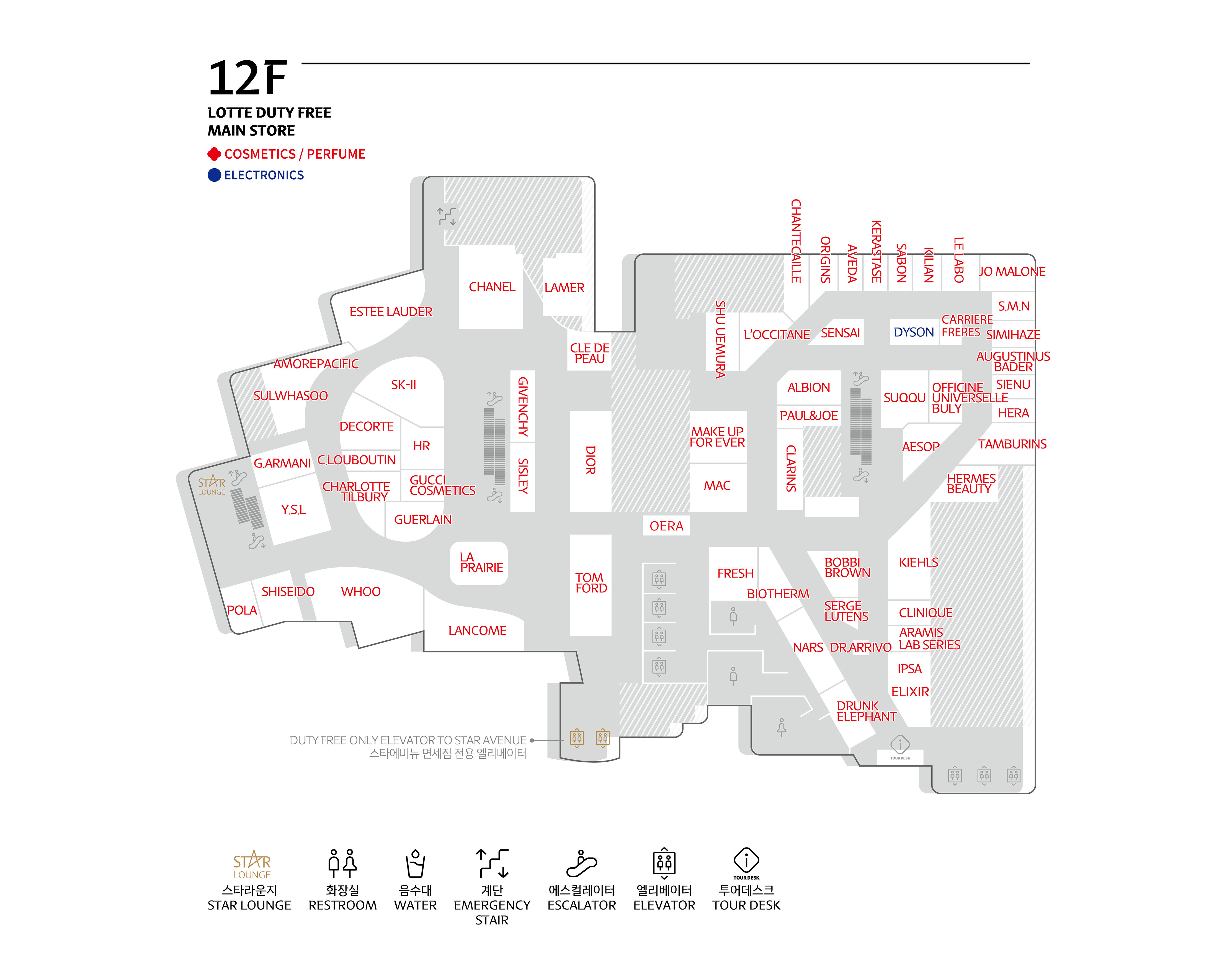 Косметика / Парфюмерия: Estee Lauder, Chanel, La Mer, Clé de Peau, Givenchy, Sisley, Dior, Tom Ford, La Prairie, Lancôme, Gucci Cosmetics, Guerlain, Charlotte Tilbury, Clé de Peau Beauté, Shiseido, Pola, Whoo (The History of Whoo), Sulwhasoo, AmorePacific, Decorté, SK-II, HR (Helena Rubinstein), YSL (Yves Saint Laurent), Armani, Shu Uemura, Chantecaille, Aveda, Origins, Kérastase, Sabon, Albion, Paul & Joe, Clarins, MAC, Make Up For Ever, Fresh, Biotherm, Serge Lutens, Nars, Dr. Arrow, Bobbi Brown, Kiehl's, Clinique, Aramis, Lab Series, IPSA, Elixir, Drunk Elephant, Jo Malone, Le Labo, S.M.N, Carrière Frères, Simihaze, Augustinus Bader, Tamburins, Hera, Aesop, Hermes Beauty, Officine Universelle Buly, Suqqu, Senteurs d'Orient, Diptyque