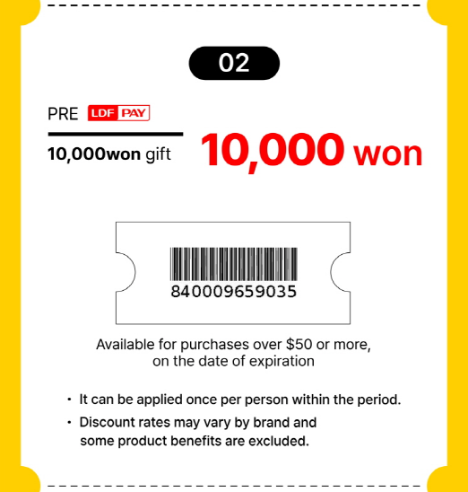 2. Подарочный купон LDF Pay на сумму 10 000 KRW (можно использовать при выполнении определенных условий покупки).