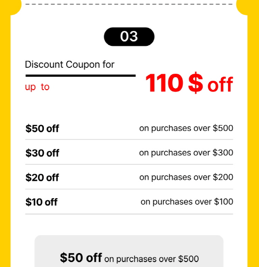 3. Дополнительные скидки в зависимости от суммы покупки (10 $ скидки при покупках на сумму от 100 $, 50 $ скидки при покупках на сумму от 500 $).